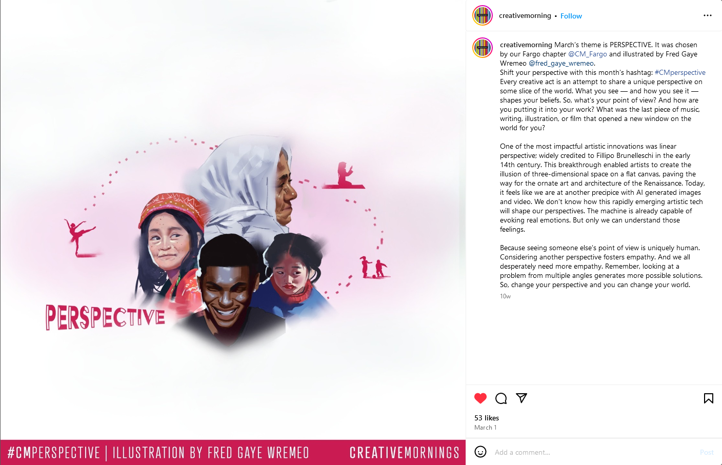When approached by creative mornings to illustrate the cover of CM Magazines March issue I was given the word perspective. Rather than looking at the term in a literal sense I decided to represent backgrounds of the individuals who make up the Fargo community. the diversity and culture present is a result of the different cultural backgrounds our community hails from.